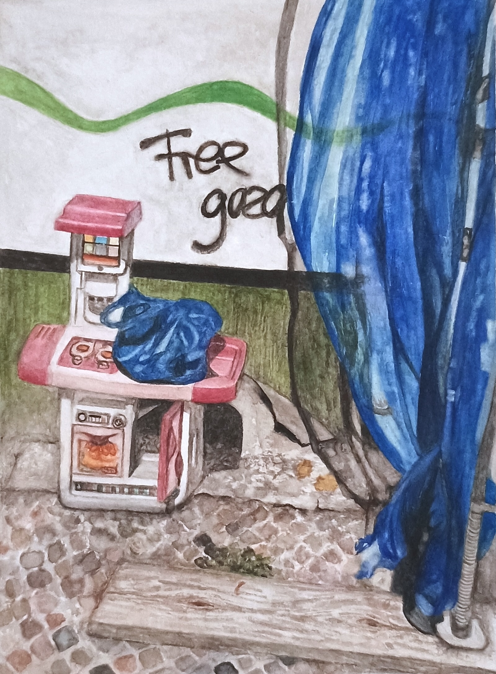 Schriftzug, Kinderküche, Pflaster, Baugerüst, Gazevorhang, grüner Horizont